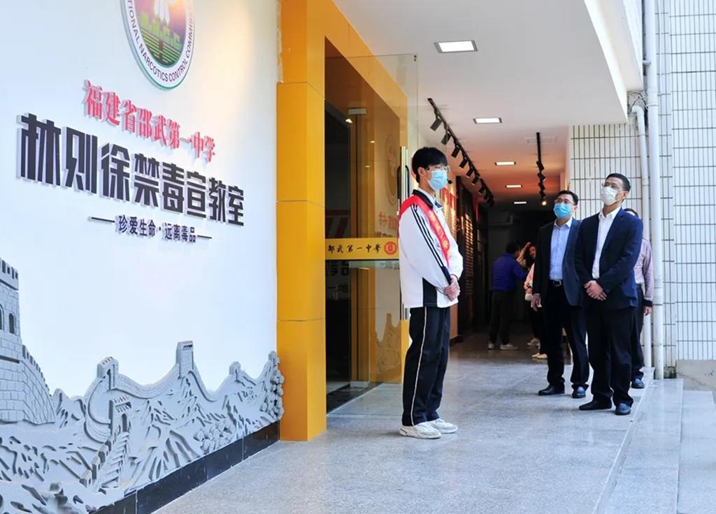 4月27日,福建省禁毒办专职副主任林群一行在邵武市政法委书记夏礼平,副市长、公安局局长郭群,教育局局长陈生良等陪同下视察了邵武第一中学林则徐禁毒宣教室,并了解学校毒品预防教育工作开展情况。