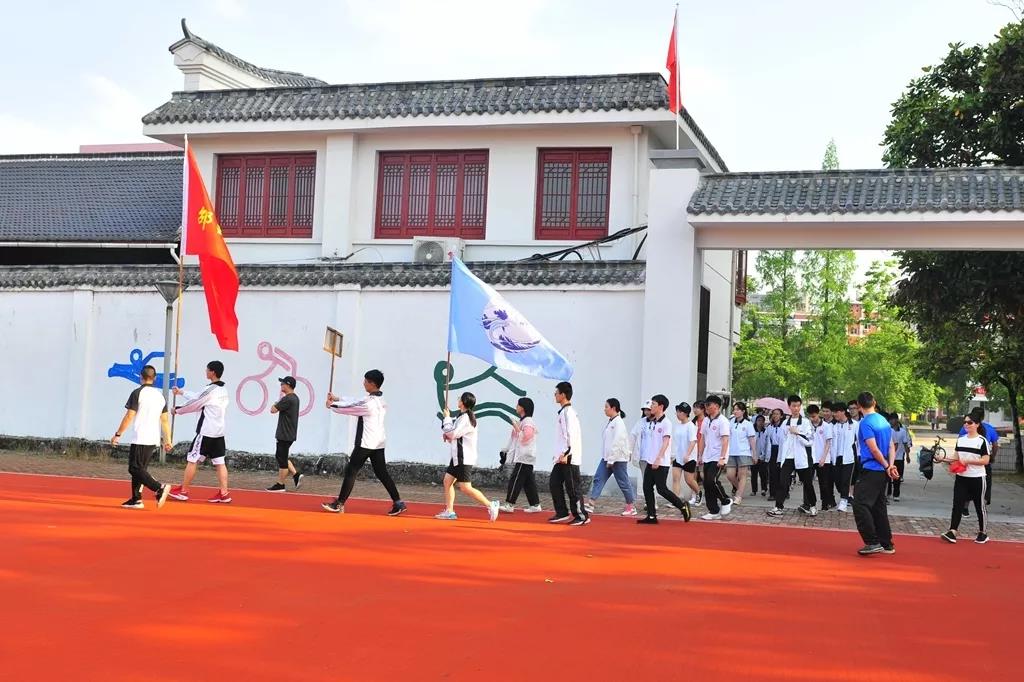 同学们集合完毕后出发,绵延数百米的行进队伍,洋溢着青春的朝气和活力,学生们手擎校旗与各班班旗,喊着口号,有序前行。