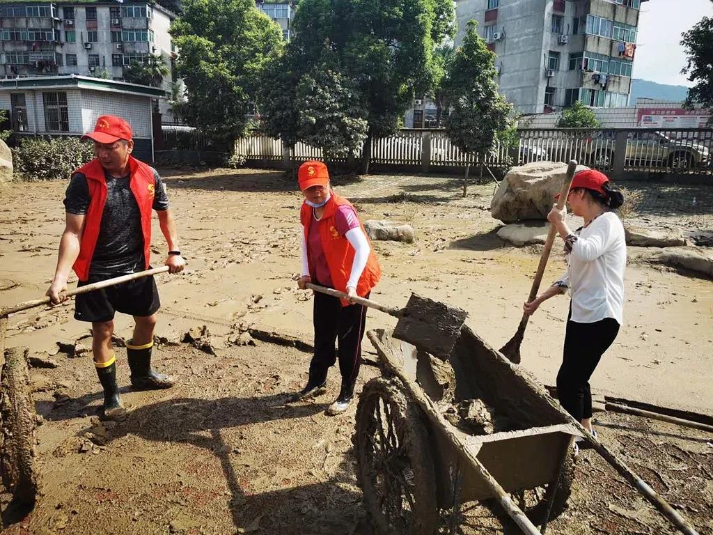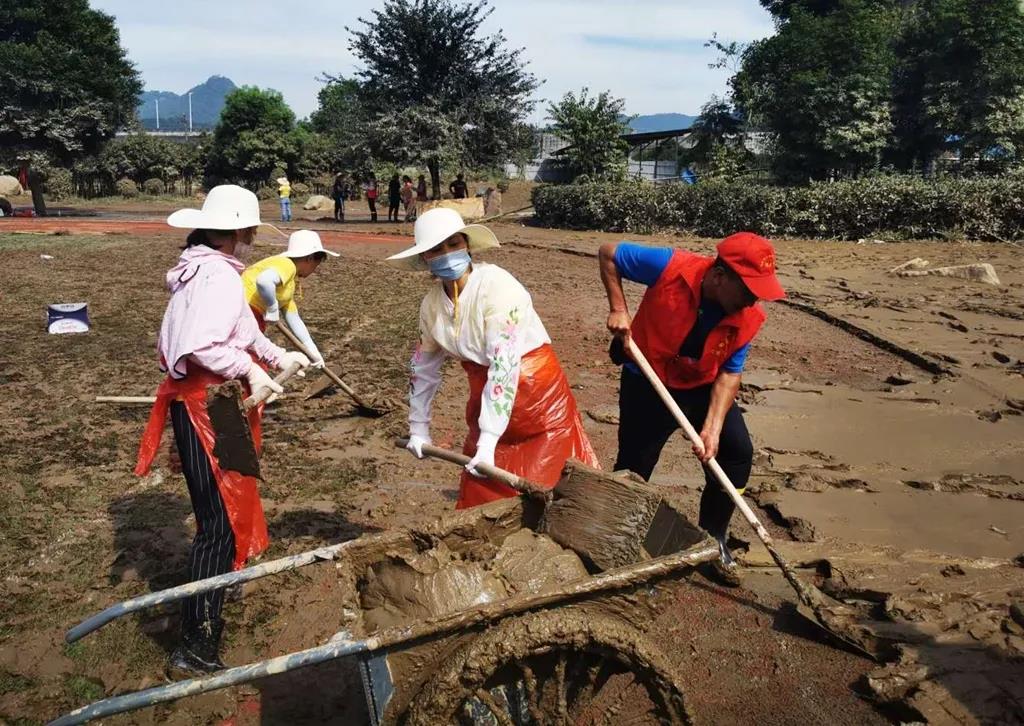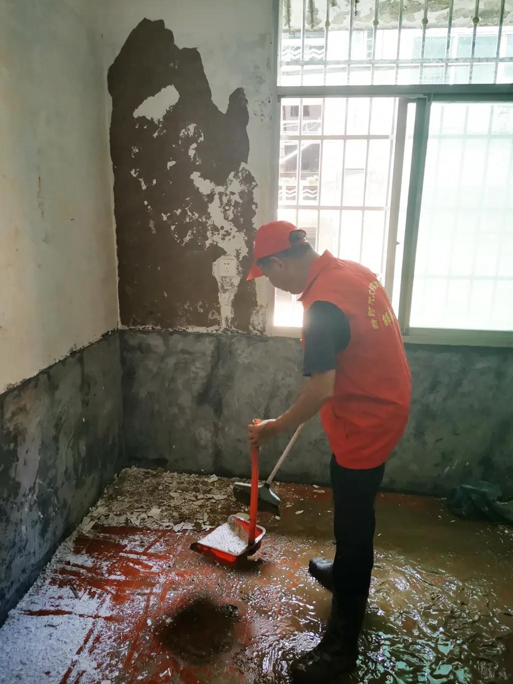 老师们不顾脏臭,趟进淤泥中挥动着铁锹、扫把等工具,争分夺秒清扫垃圾、清理地面。
