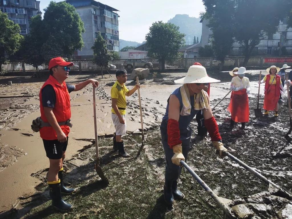 7月9日的严重内涝导致邵武市晒口善德中小学校园内部淤泥满地,为支援晒口灾后清淤工作,邵武一中吴萌校长携吴昊副校长及一中部分教师共21人,于12日上午来到善德中小学校园内,帮助清理被淤泥覆盖的操场、教室、办公室等。