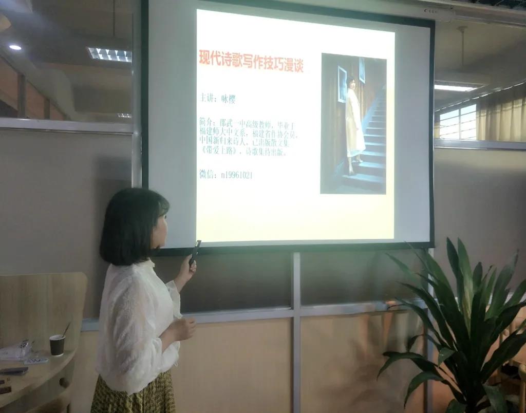 和平诗社自2017年创立以来,至今已经走过了三年的时间。在这三年的时间里,诗社的社员们坚持在课余时间进行诗歌创作,他们经常在群里进行同题诗写作,在写作中完成交流和互动。在勇英老师的支持和鼓励下,社员们的诗歌在一中校刊、西澜诗苑、邵武报等报刊杂志发表。由于这两年不断有新社员加入,勇英老师意识到对学生进行诗歌创作指导的必要性,所以,特意为学生们准备了这次讲座。