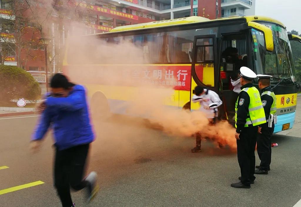 12月9日下午5时许,一辆大巴车“横亘”在学校主干道上,车头部位“浓烟”滚滚,弥漫着整个车体。只见,一个个身着校服的孩子,手捂口鼻,弯腰、低姿,在交警同志的带领下,从“应急车门”鱼贯而出,有序的撤离到“安全地带”。这是邵武一中正在开展的主题为“知危险会避险,安全文明出行”的“邵武一中寄宿生安全乘车,应急避险疏散演练”。