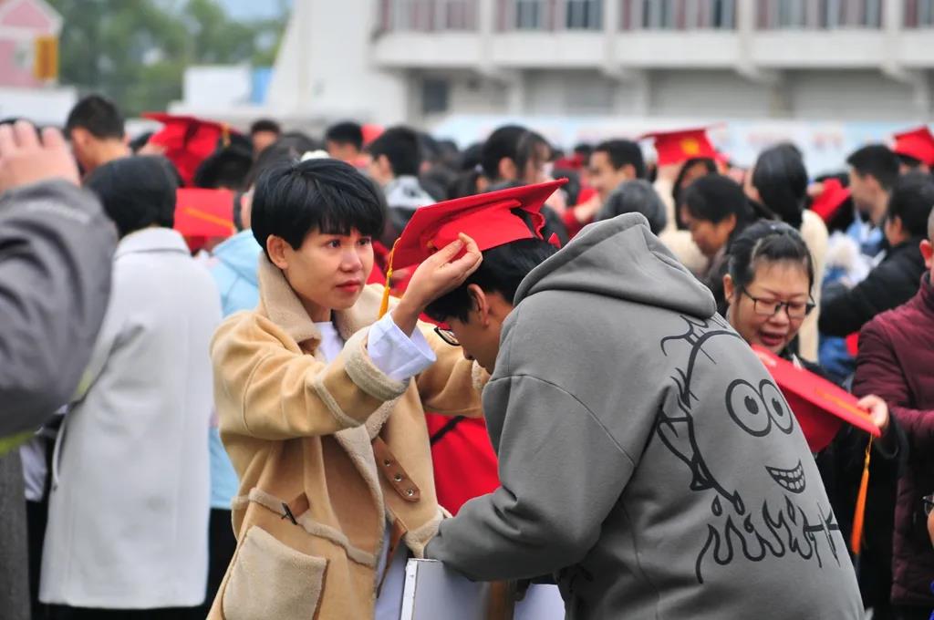 家长为孩子们佩戴成人帽