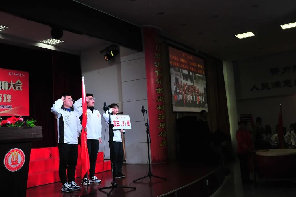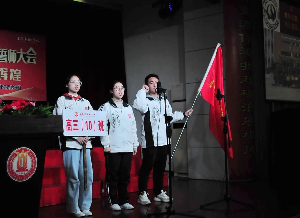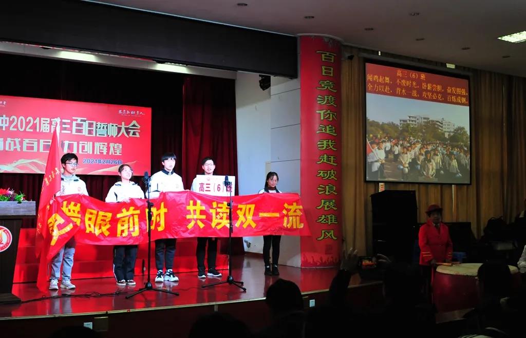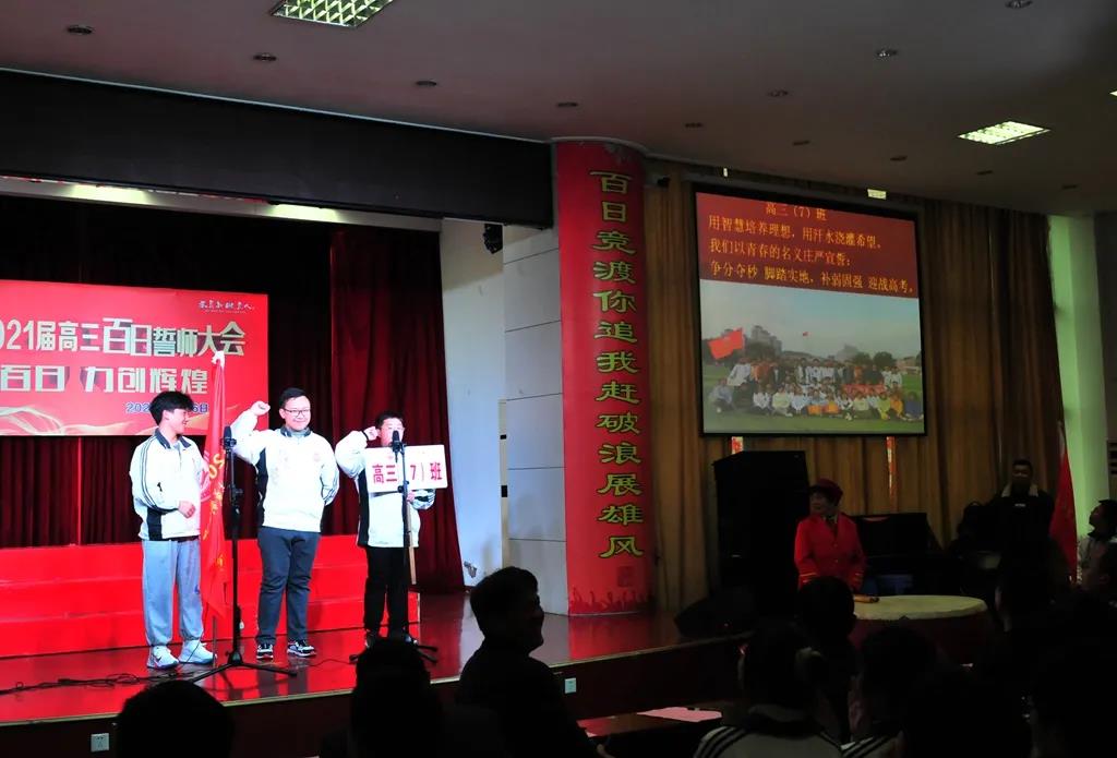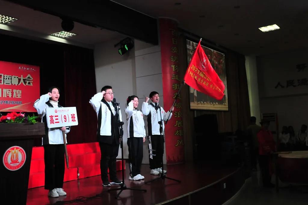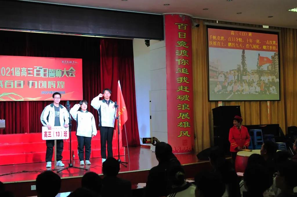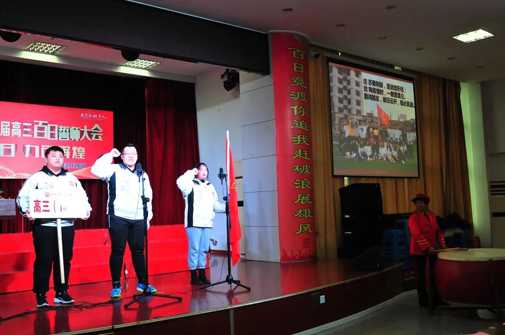 “精讲巧练、把握方向;甘做人梯、培育栋梁”“慢做会,求全对。稳做中档题,一分不浪费。冲刺985,决战211”“全力以赴,背水一战。攻坚必克,百炼成钢”“鹰隼试翼,永不言弃。风尘翕张,直面阳光”“战百日,赢高考!博百天,创辉煌!”……岂曰无衣,与子同袍。在气势磅礴的阵阵鼓声里,高三年段全体老师和14个班级依次进行铿锵有力的宣誓,点燃了全场高三学子冲刺百日,拼博奋斗的热血与豪情。