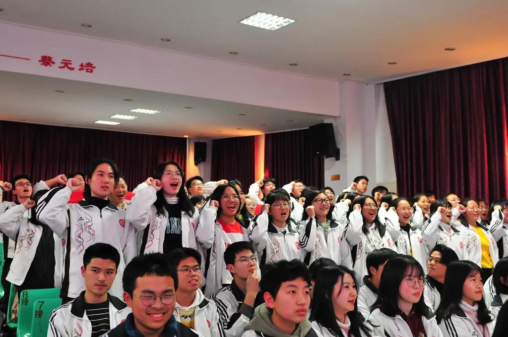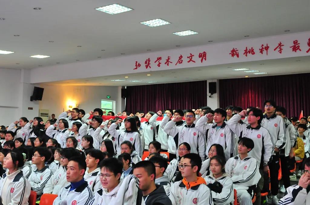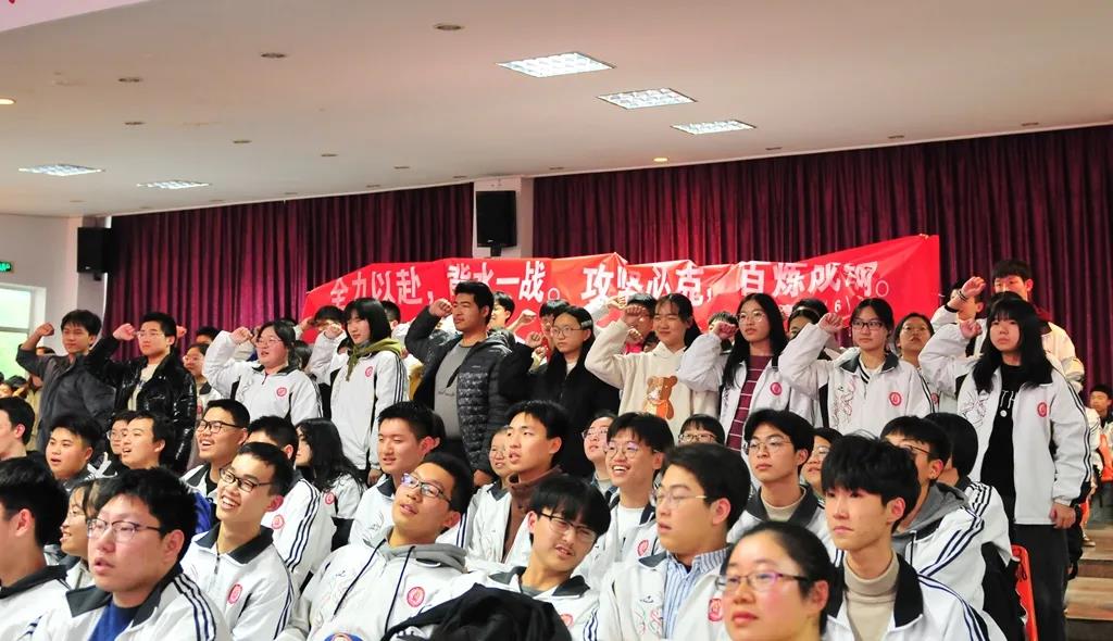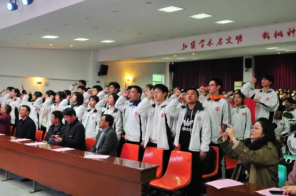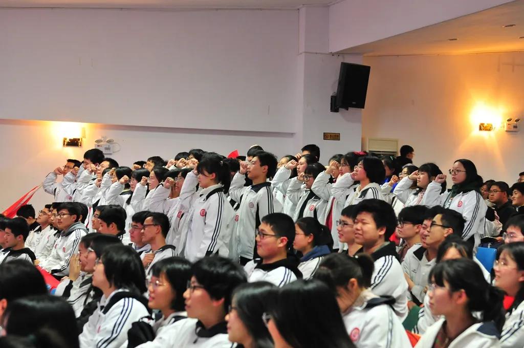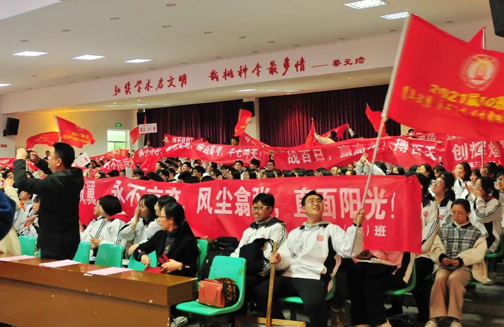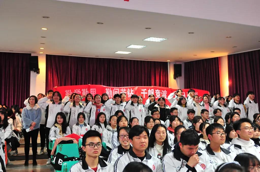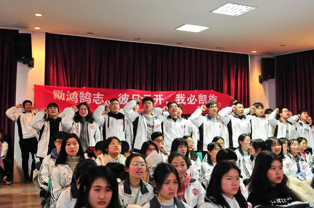 “精讲巧练、把握方向;甘做人梯、培育栋梁”“慢做会,求全对。稳做中档题,一分不浪费。冲刺985,决战211”“全力以赴,背水一战。攻坚必克,百炼成钢”“鹰隼试翼,永不言弃。风尘翕张,直面阳光”“战百日,赢高考!博百天,创辉煌!”……岂曰无衣,与子同袍。在气势磅礴的阵阵鼓声里,高三年段全体老师和14个班级依次进行铿锵有力的宣誓,点燃了全场高三学子冲刺百日,拼博奋斗的热血与豪情。