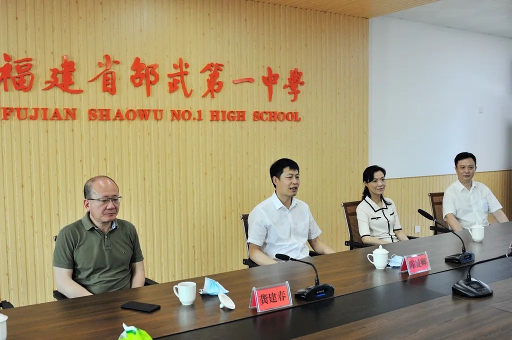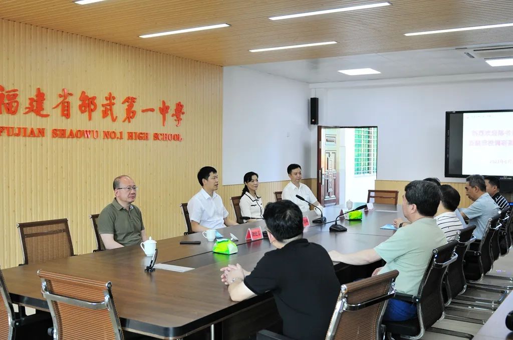 随后,调研组一行在校行政会议室召开了座谈会,陈书记对广大教职工们为教育事业所作的贡献予以充分肯定。他强调,要创新教学方式,采取多种载体、协调整合多种教学要素,不断增强教学的针对性和实效性。要提高教学质量,结合创建义务教育优质均衡县,加快推进一中新校区建设,全面改善学校办学条件,不断优化和扩充城镇教育资源。要加强交流合作,持续深化与学军中学、镇海中学的交流合作,学习宁化一中先进经验,通过邀请专家来邵集中培训、选送教师到名校脱产研修等多种途径,实现教育资源的共建共享,努力走出一条具有邵武一中特色的教学道路。