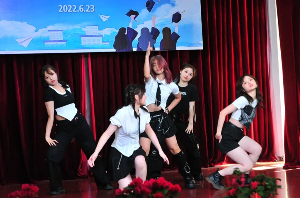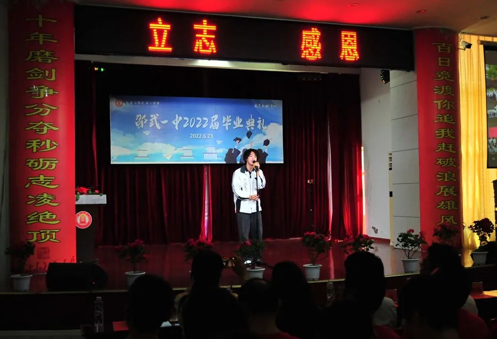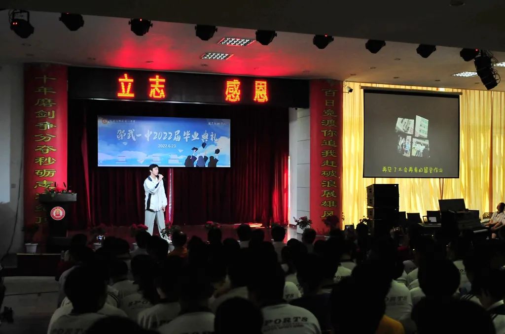 典礼上,有心潮澎湃的真情流露,也有唤醒感官的视听盛宴。同学们通过多种形式展现2022届毕业生风采。女生表演《Tomboy》、《LOCO》等劲歌热舞,活力四射;乐器合奏《大鱼》+《乘风》典雅悠扬,展示了一中学子多才多艺的一面。刘海洋、吴垚滔两位同学分别演唱了《不说再见》、《那些花儿》,风采不凡,极具亲和力。他们亲手剪辑的视频更是锦上添花,唤起师生们的深情回忆,是对“时光不老,我们不散”的最好诠释。