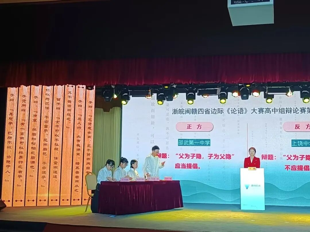 9月24日,浙皖闽赣四省边际《论语》大赛在浙江衢州中国儒学馆举行。我校黄诗涵、黄韵瑶、黄燕玲、熊泸曼和陈厚涵五位同学组队参加了高中组辩论赛。
