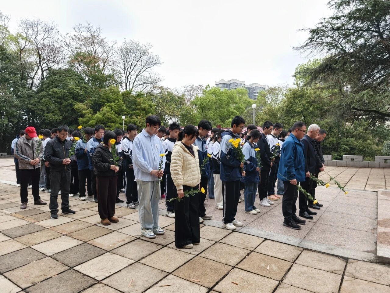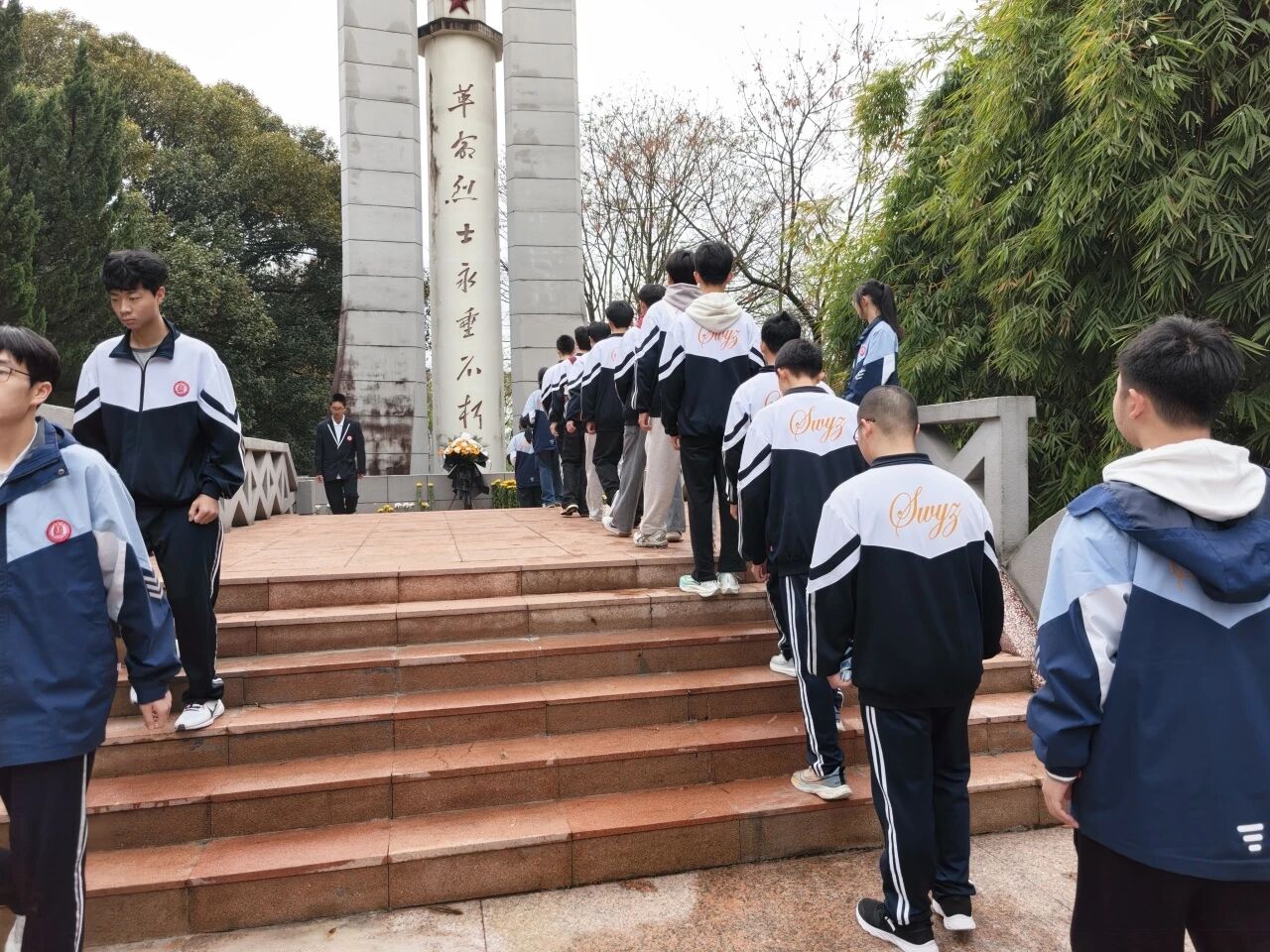仪式尾声,全体师生在纪念碑前合影留念。一张张青春的脸庞坚定而庄重,那是信仰的传承,也是未来的希望。随后,队伍有序离场。来时脚步沉重,归时心中明亮——这不仅是一次祭扫,更是一堂行走的思政课,一次心灵的洗礼。