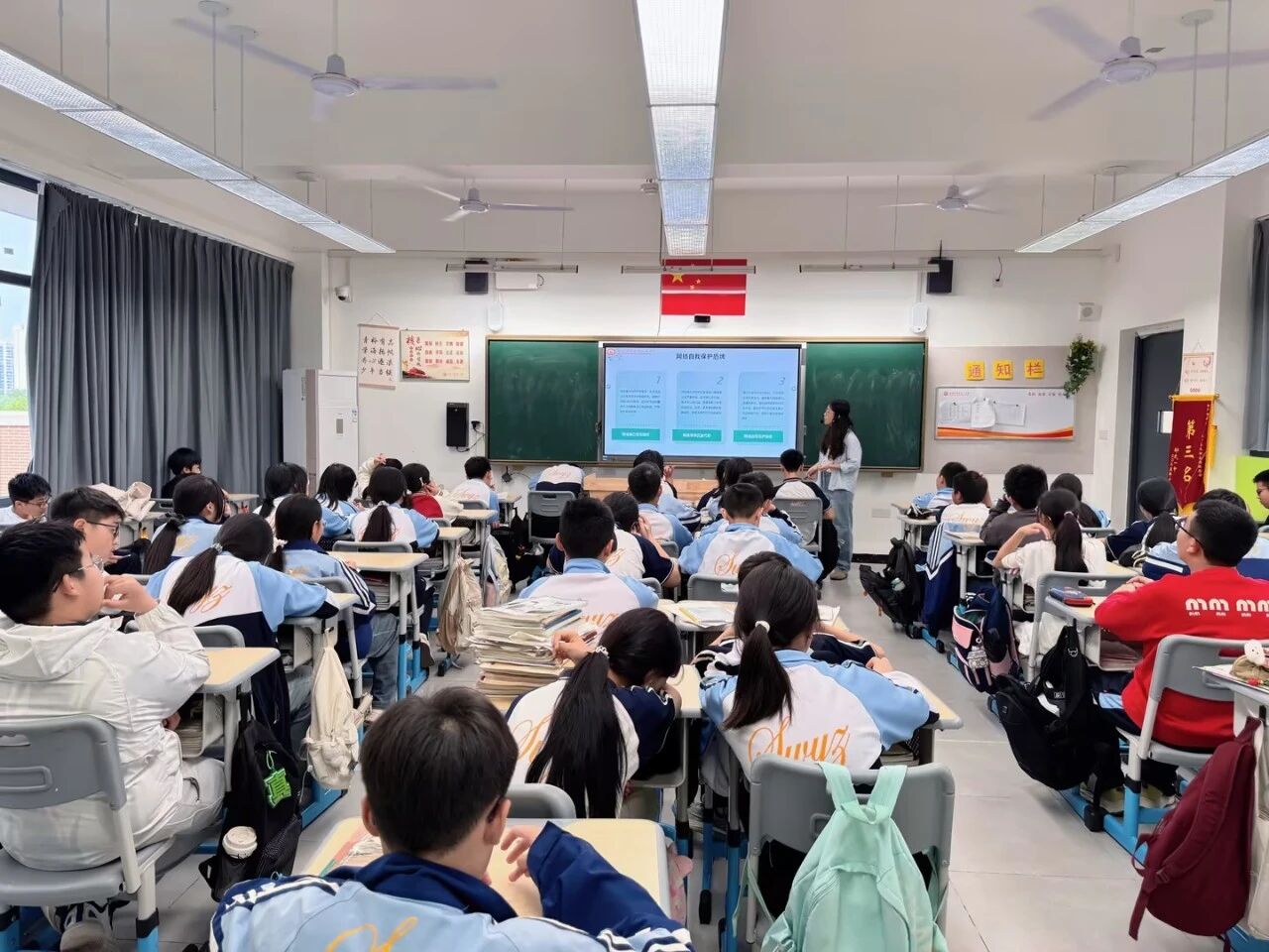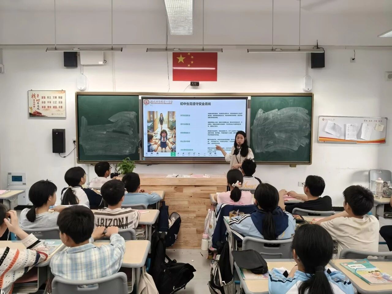 各班级同步召开“关注安全,守护生命”主题班会。班主任结合初中生身心特点,围绕交通安全、防校园欺凌、防溺水、网络安全、身心健康等五大核心内容展开教育:讲解交通规则与出行安全,引导文明守法出行;剖析校园欺凌危害,传授自我保护与求助方法;普及防溺水常识,筑牢生命安全底线;强调网络文明、个人信息保护、拒绝网络谣言与不良信息;关注心理健康,引导正确调节情绪、积极面对压力。进一步提升了生命安全与自我防护能力。