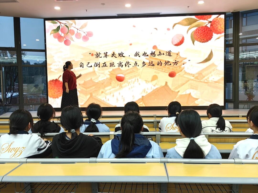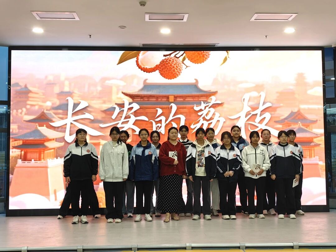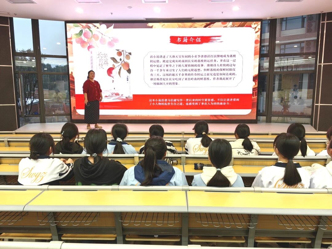 在内容简介环节,施冰莹老师以“一骑红尘妃子笑,无人知是荔枝来”为引,生动讲讲述了小人物李善德接下“不可能任务”,跨越千里运送荔枝的曲折历程。通过朗读小说中的精彩片段,同学们仿佛跟随主人公穿越到盛唐长安,亲历荔枝三日送达的极限挑战。