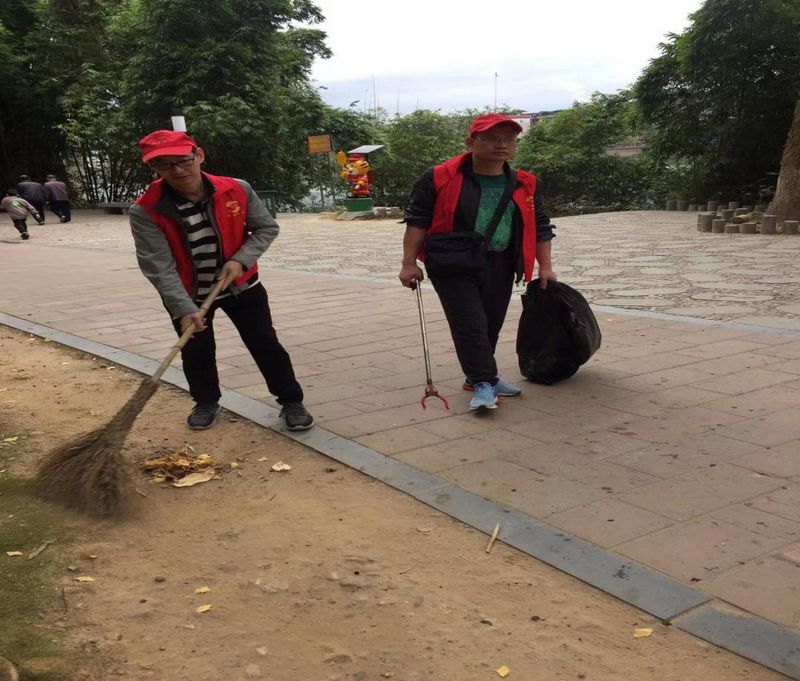 11月14日、21日,高一年段吴显标,程凤珠、张仲辉等十多位老师利用周六课余时间到熙春公园清扫垃圾,文明劝导。