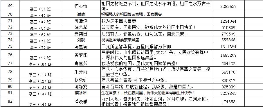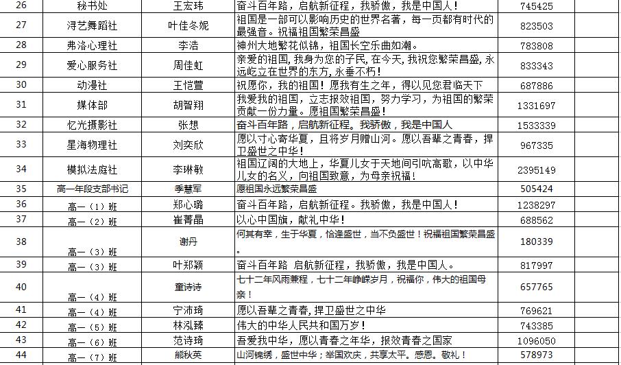 邵武一中各处室主任、团委书记、年段支部书记、班级团支部书记、学生会及社联部长们代表自己所在的部门通过扫描二维码方式参与向国旗敬礼活动并写下对祖国的美好祝福(寄语)。