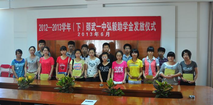 2013年6月,邵武一中在校二楼行政会议室举行弘毅助学金发放仪式。仪式上,18名品学兼优的在校生共获得了24000元的资助,政教处主任李秀林老师引用:“士不可以不弘毅,任重而道远---《论语泰伯》”进一步勉励受助同学增强信心和力量,自强不息、立志成才,以优异的成绩报答热心于慈善事业的企业家和社会各界人士。