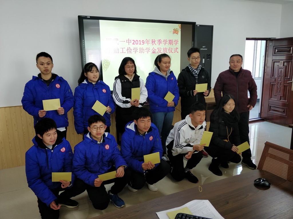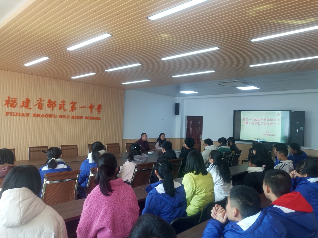 2019年12月12日,邵武一中在四楼会议室举行了2019年秋学期勤工俭学助学金发放仪式,48位勤工俭学同学领取了勤工俭学助学金。